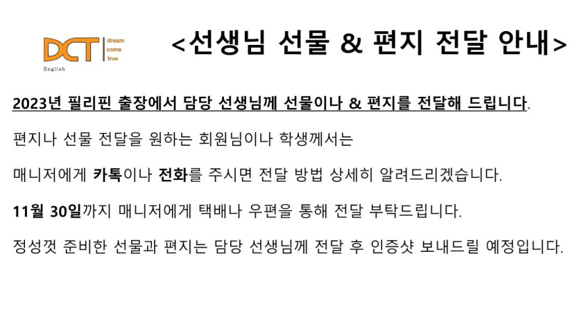 담당 선생님에게 편지나 선물을 전달하고 싶은 회원들은 연락해주세요