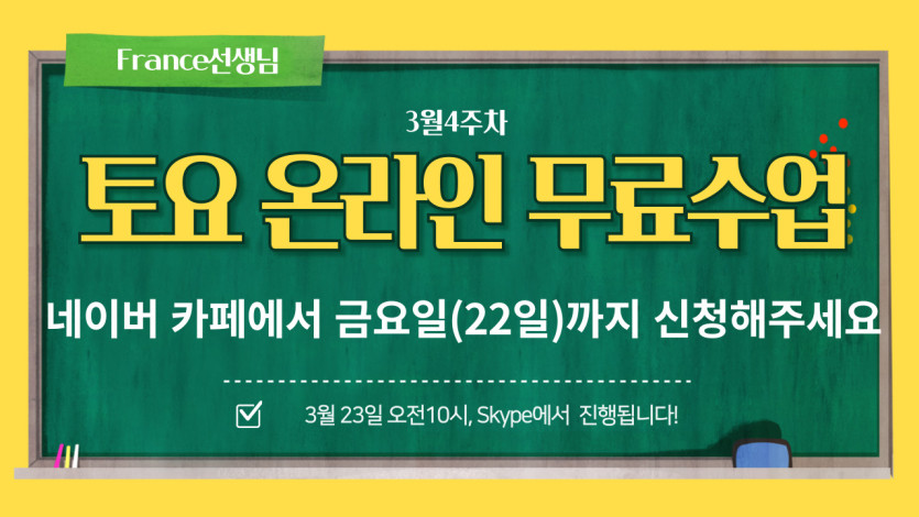 3월4주차 토요 무료수업이 3월23일 토요일 오전10시 스카이프에서 진행됩니다.